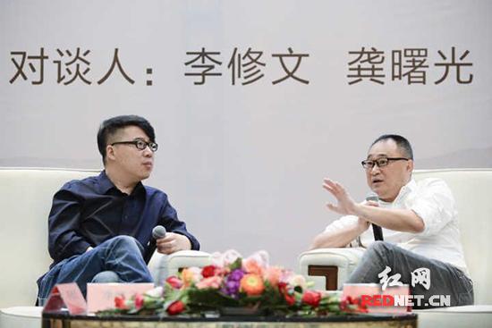 5月31日,河北廊坊,作家、影視劇編劇、監(jiān)制李修文(左)和湖南出版投資控股集團(tuán)黨委書記、董事長,中南傳媒董事長龔曙光(右)進(jìn)行題為“人民山河文辭袈裟”的文學(xué)對(duì)談。攝影/辜鵬博