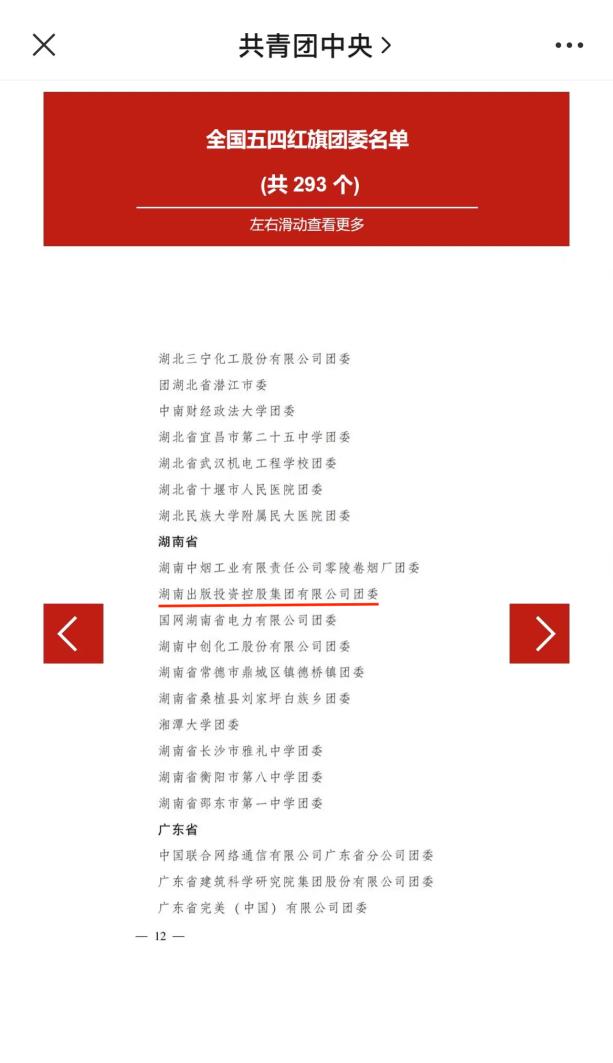 2022年是中國(guó)共青團(tuán)成立100周年。近日,共青團(tuán)中央作出表彰決定,授予293個(gè)團(tuán)組織全國(guó)五四紅旗團(tuán)委稱號(hào),授予377個(gè)團(tuán)組織全國(guó)五四紅旗團(tuán)支部稱號(hào),授予457人(含追授3人)全國(guó)優(yōu)秀共青團(tuán)員稱號(hào),授予341人(含追授1人)全國(guó)優(yōu)秀共青團(tuán)干部稱號(hào)。湖南出版投資控股集團(tuán)有限公司團(tuán)委榮獲全國(guó)五四紅旗團(tuán)委稱號(hào)。